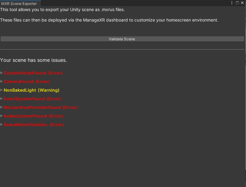 Validatebutton. This will validate your scene and violations (if any) in your scene will be highlighted. Click on an issue to expand it. A brief description and any relevant GameObject or Asset will be shown.- Issues shown in red will prevent export unless you address them